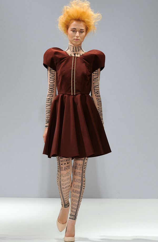 Carlotta Actis Barone’s designing style is always political in direction and focused on true social matters. Her graduate collection featured 8 looks taking inspiration from the theme of Feminism, particularly the suffragette movement from the beginning of last century. Her pieces are directed at strong, feminine women that believe in a liberated female condition and strive for gender freedom by paying attention to their fascinating bodies and forms, which she learnt to appreciate profoundly through her studies in figure drawing Fashion Mode have teamed up with Carlotta for her new collection, entitled “wear my skin” which aligns her political views and her designs. This collection is based on the fight against racism, particularly on the deportation of Africans to America before the 1865 civil war. This collection has been designed to demonstrate the cruelty of those acts, and attempts to translate the victims pain and suffering into something that everyone can experience through wearing the clothes. The colour palette is based on a range of skin colours from each human race, allowing the exchange of shapes and colours to allow different races to get into someone else’s skin. In Carlotta’s words; turning rags, chains and scars into high-fashion clothes allows the use of our bodies to communicate the shame from all acts of racism either past or future The collection features rich drapery and cuts inspired by the worn, knotted and over-sized appearance of slave’s garb as they toiled in the fields. The shoulders on the pieces become very wide and structured to imitate strong, muscular shoulders and denim dungarees, typical work clothes, are transformed and reinvented into oversized trousers supported by braces, sliding down the hips and revealing parts of the body previously hidden. The fabrics are humble simple shirt cottons, like the cotton grown on the plantation fields. Femininity is exalted as it emerges from the details of a man’s working shirt which once enlarged, becomes a dress or top.The colour palette of the collection is dominated by the shades of the human skin, from light to dark, to represent the men and women who have suffered the indignity of slavery. Wearing these clothes will be like wearing another skin.